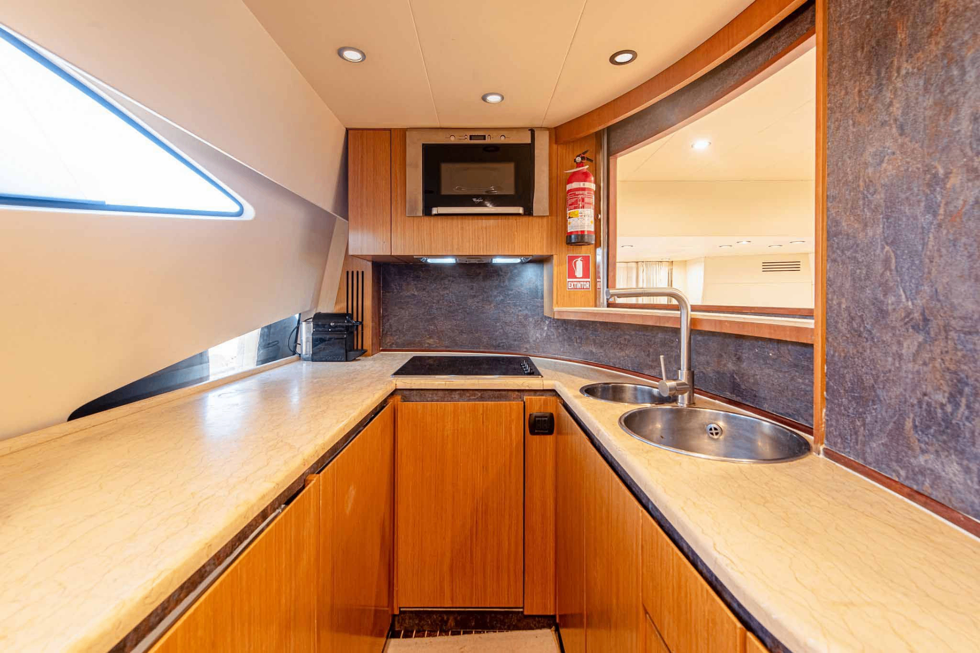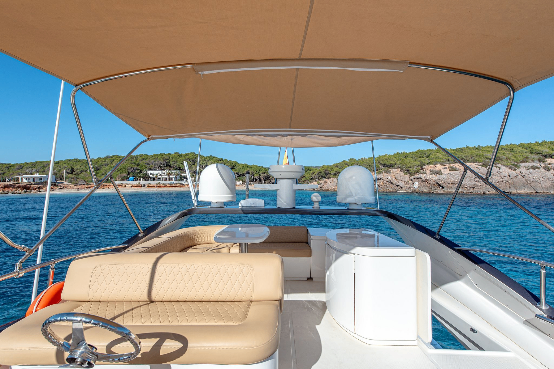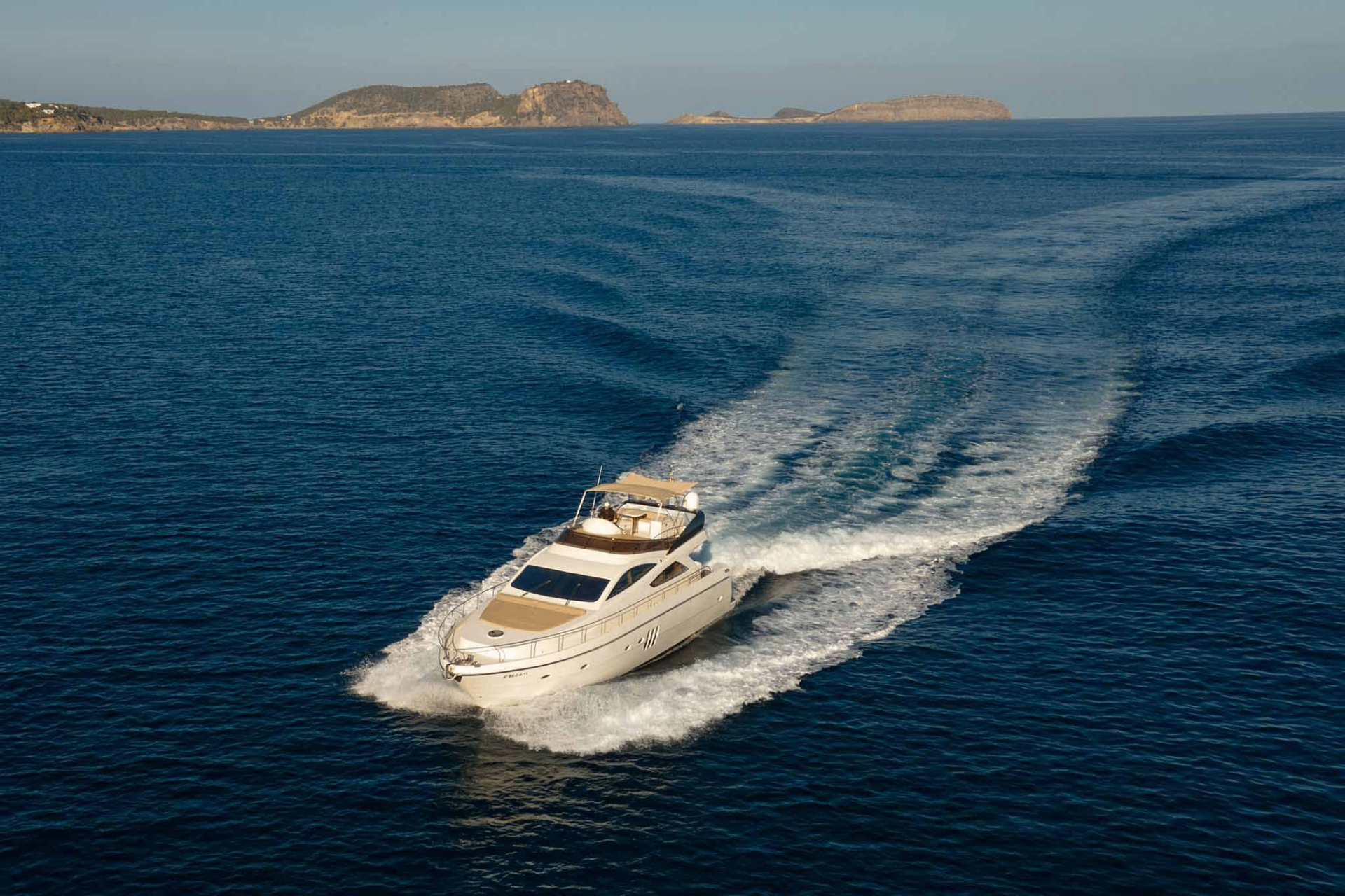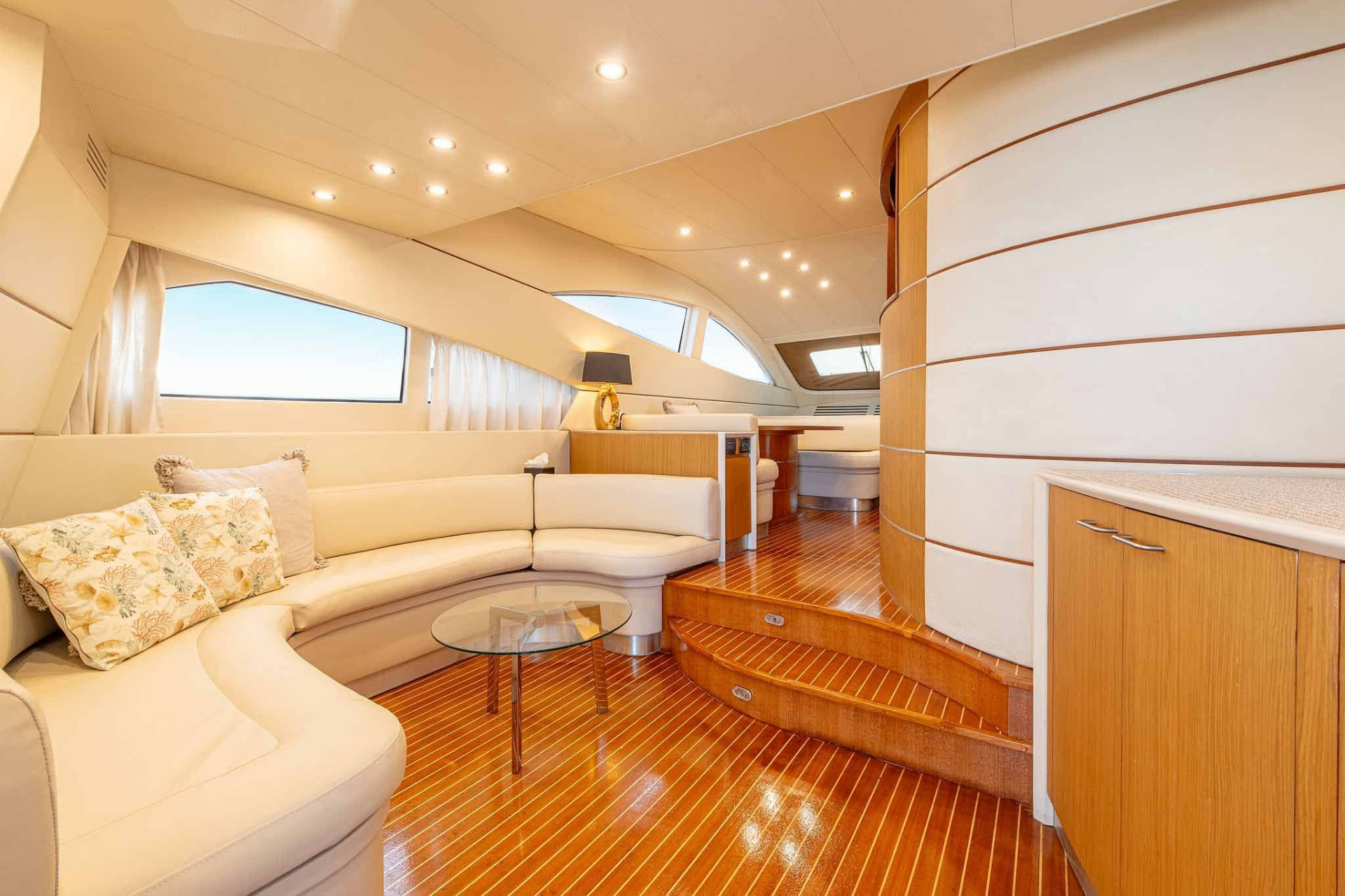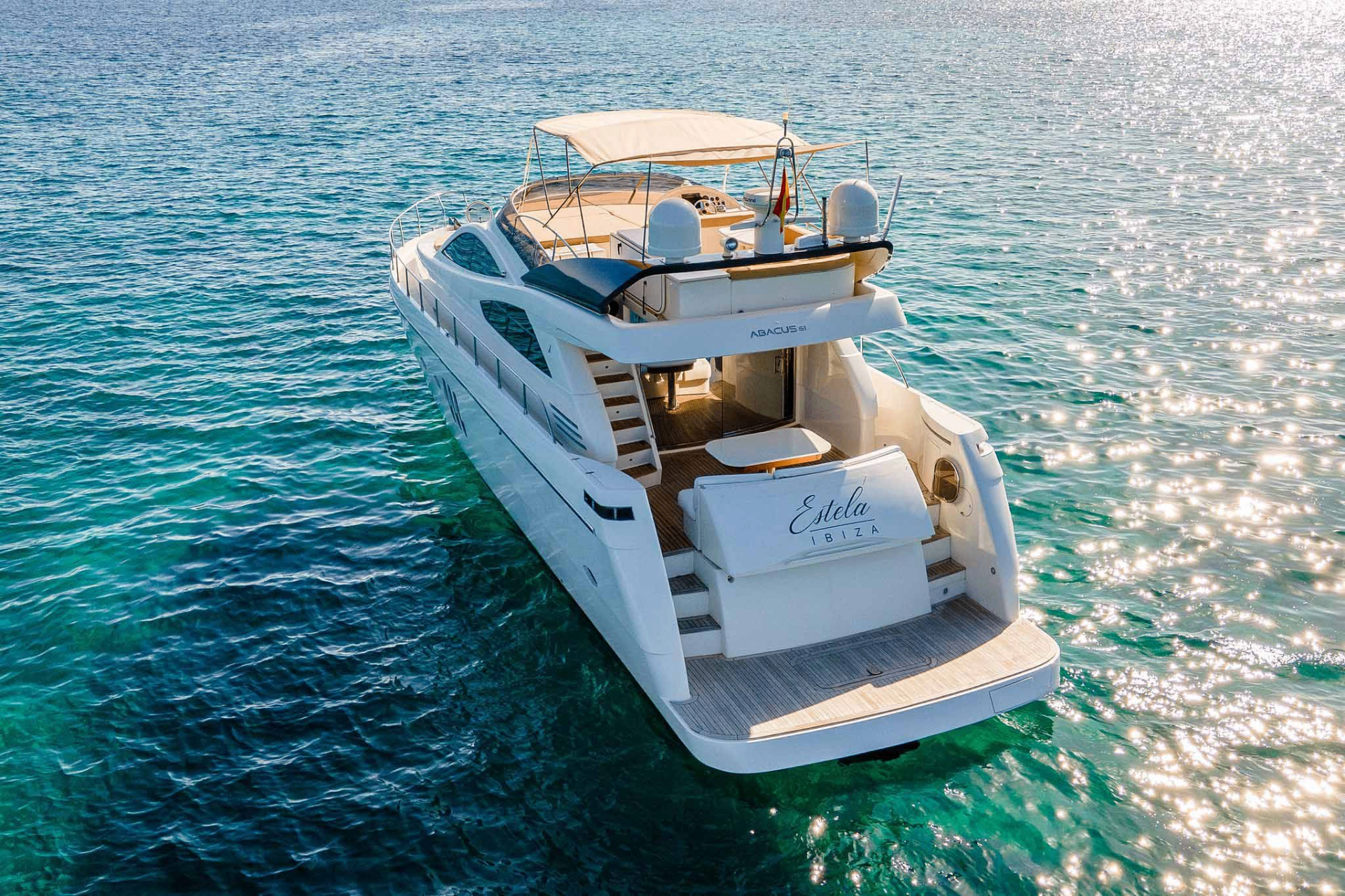 At 18.66 metres with a five-metre beam, the Abacus Marine 61 is a Sicilian-built flybridge yacht designed by Fulvio De Simoni — an architect whose work defines much of what contemporary Italian yachting looks like. Twin CAT diesel engines delivering over 1,000 hp each power a GRP planing hull built using DIAB vacuum infusion, a construction method that achieves both structural rigidity and weight reduction simultaneously. The flybridge — the vessel’s social centrepiece — accommodates dining, sun lounging, and a wet bar beneath open sky, while the aft cockpit below provides a second alfresco space connected to the water via a hydraulic swim platform. Below deck, three staterooms finished in fine timber veneers and premium leather accommodate six guests across private en-suite cabins, each with air conditioning and considered storage throughout. A crew of two operate from dedicated quarters. Founded in 2003, Abacus Marine built its reputation on exactly this — speed and comfort without compromise, in equal measure.