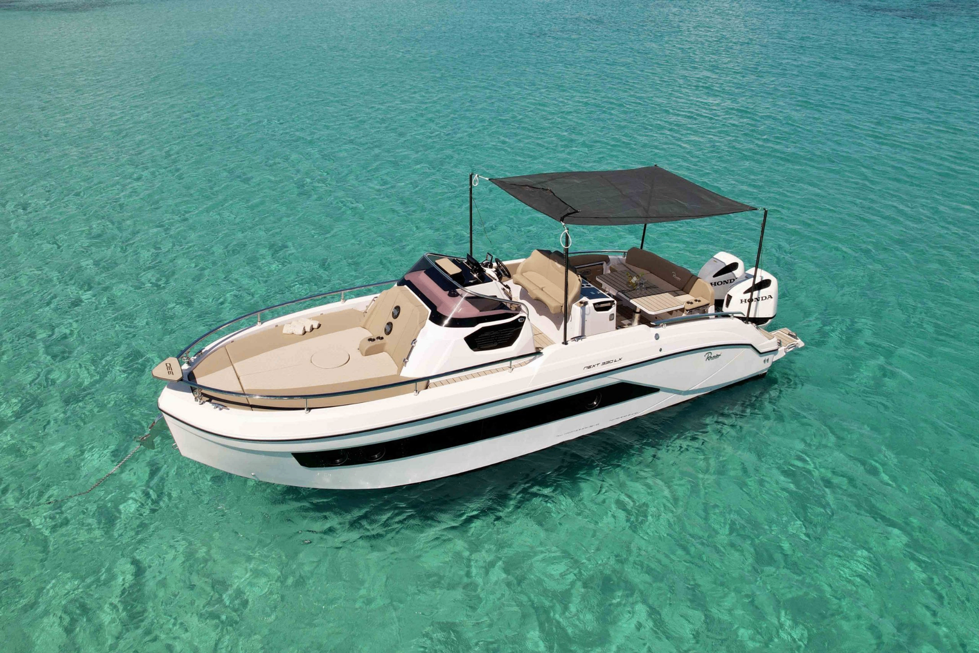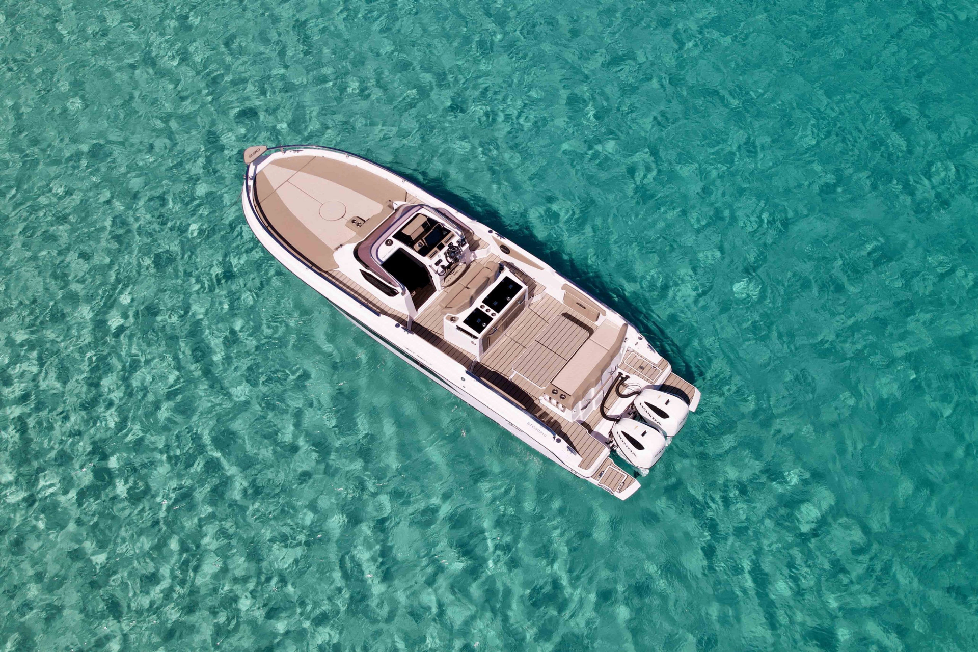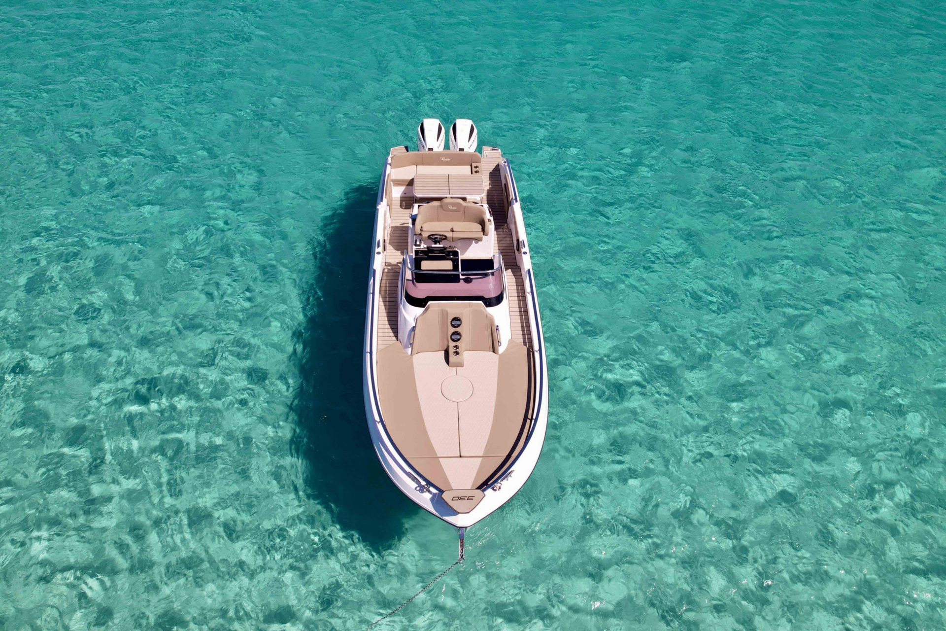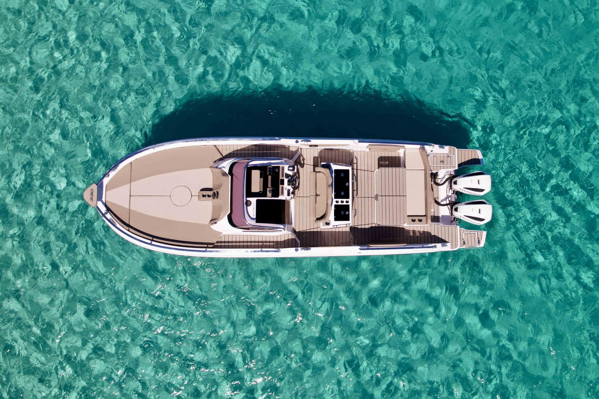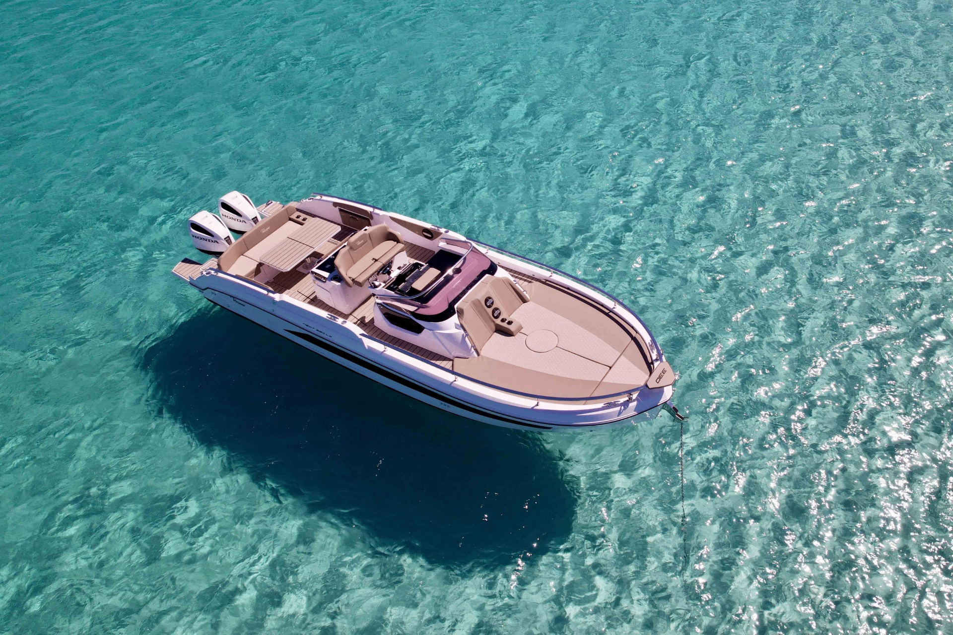 At 10.15 metres with a 3-metre beam, the Ranieri Next 330 LX is an Italian-built sundeck that makes exceptional use of its dimensions. The hull features Ranieri’s proprietary HIS — Hull Innovative System — a double-redan stepped design engineered for improved airflow, reduced drag, and a top speed of 45 knots when paired with twin outboard engines up to 800 hp combined. At cruising trim, the vessel settles into an efficient 23 knots with notably low fuel consumption. On deck, a generous uninterrupted bow sunpad and a well-appointed stern area with dual swim platforms define the layout, while the helm station seats two with a full instrument dashboard, integrated galley, and refrigeration drawers. Below, a four-berth cabin with dedicated head compartment is finished in considered materials throughout. The LX designation — standing for Lusso — is carried with purpose.