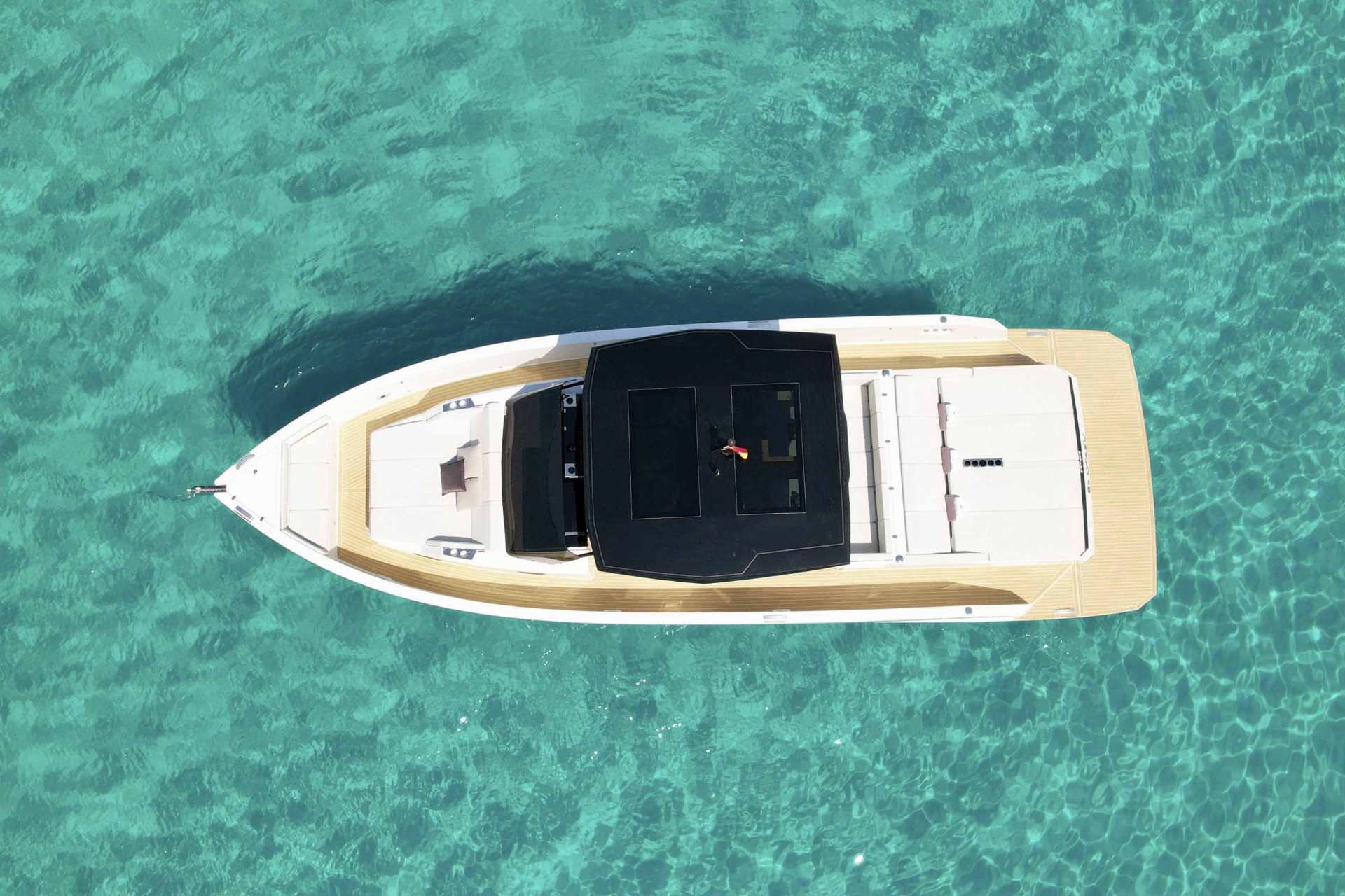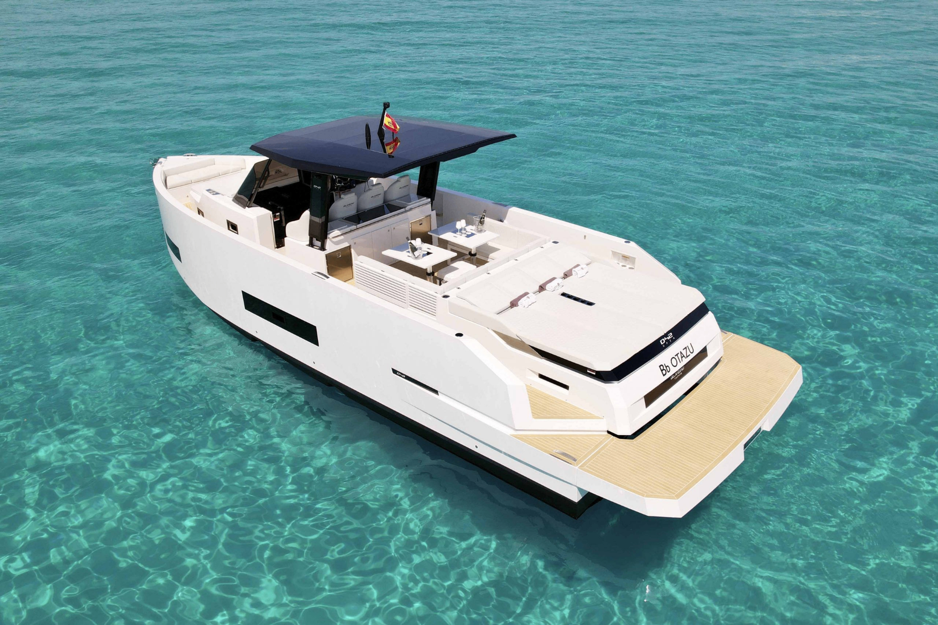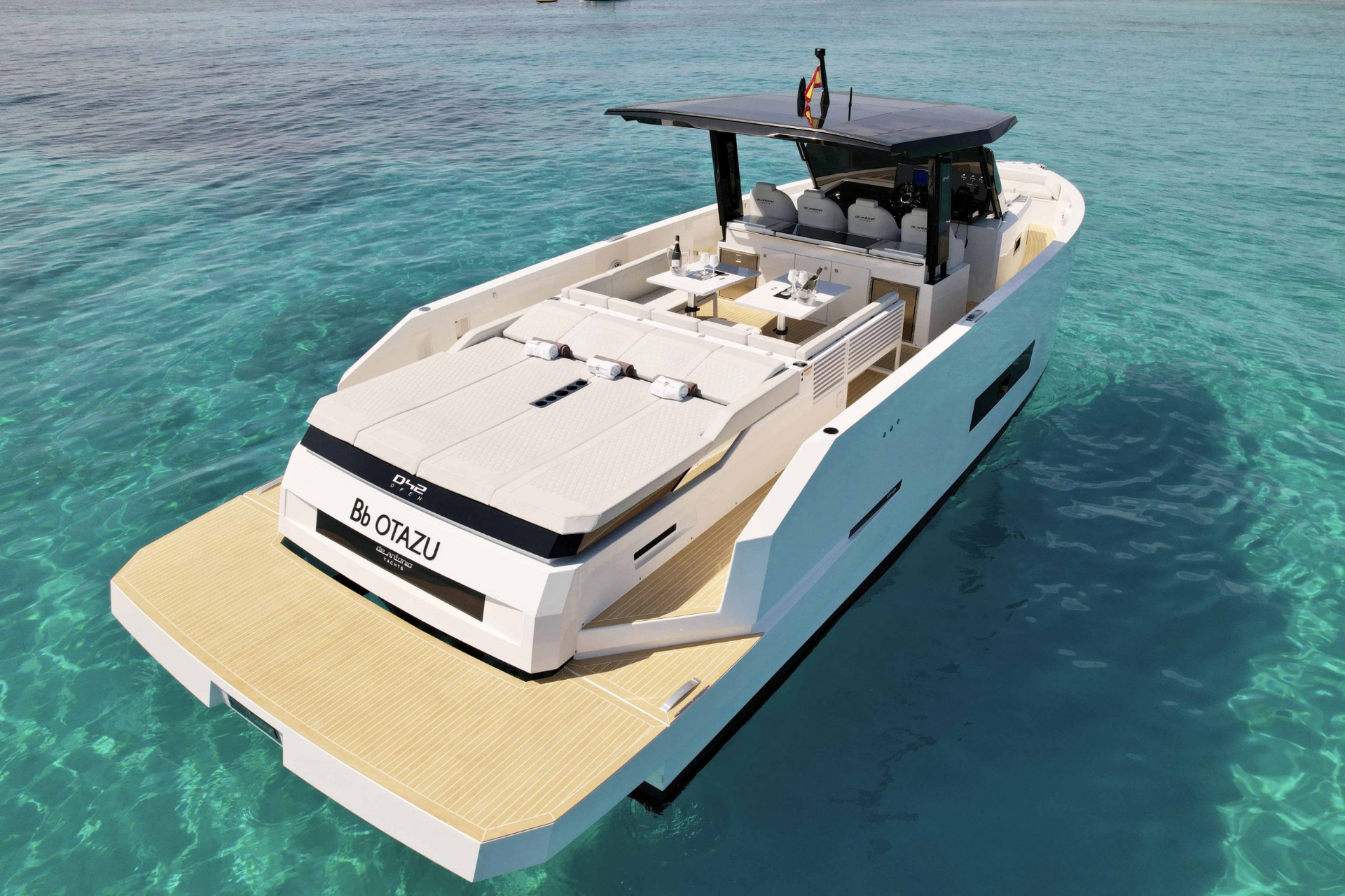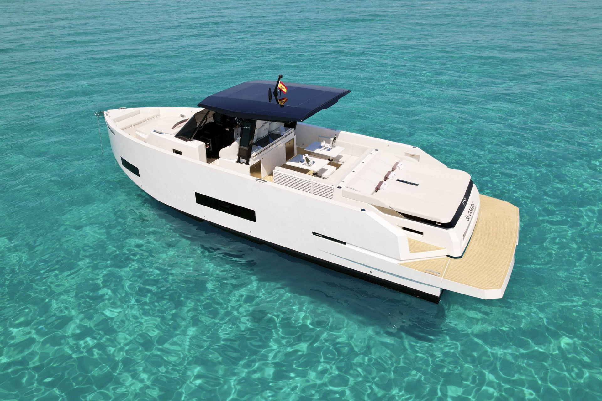 Built in Spain at 12.64 metres with a near four-metre beam, the De Antonio D42 is defined by its plumb bow, flat topsides, and a deck layout that wastes nothing. Triple Mercury outboard engines — configurable from 900 to 1,200 hp combined — are concealed beneath the aft platform, preserving the vessel’s clean, uninterrupted stern and freeing the interior of mechanical intrusion. The double-stepped fiberglass hull delivers a top speed of 46 knots while maintaining stability across varying sea states. On deck, three distinct social zones run from a generous bow sunpad through a central helm and dining cockpit to a wide aft lounge — each connected by walkways deep enough for safe, effortless movement. Below, two guest cabins and a dedicated head compartment provide accommodation for extended time away. The D42 carries the restraint of its design with the same conviction as its speed.